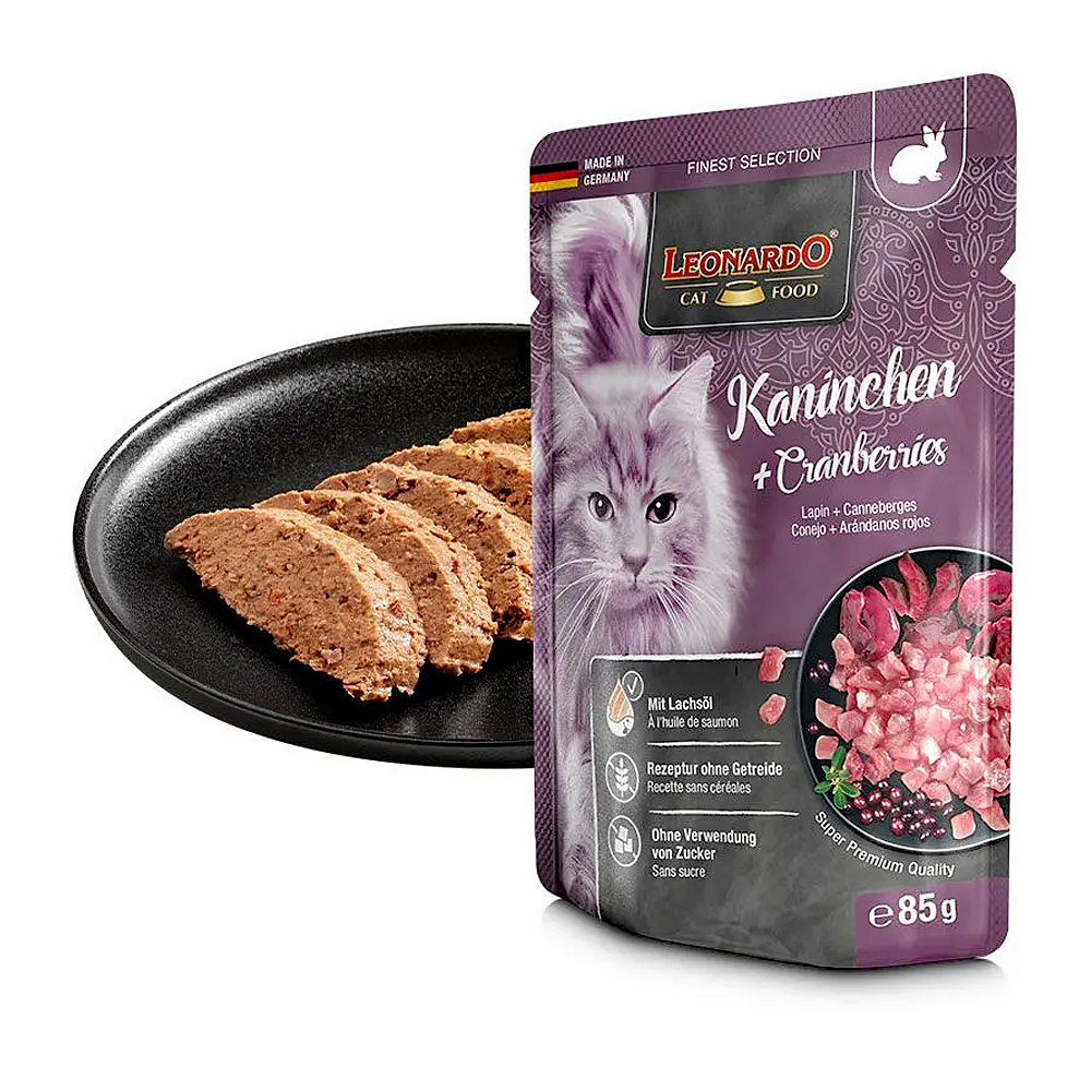Richtig schlecker ist diese Kombination aus aromatischem Kaninchenfleisch und Cranberries, dem Superfood mit vielen wertvollen Inhaltsstoffen. Und darüber hinaus gut fürs Fell: Denn LEONARDO Kaninchen + Cranberries bringt mit mehrfach ungesättigten Fettsäuren aus Lachsöl das Haarkleid zum Glänzen!