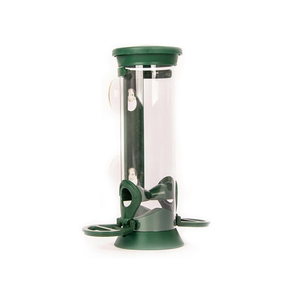Die Samen-Säule "Discovery" aus Kunststoff besitzt 2 Futteröffnungen und lässt sich mit Saugnäpfen an der Fensterscheibe befestigen.