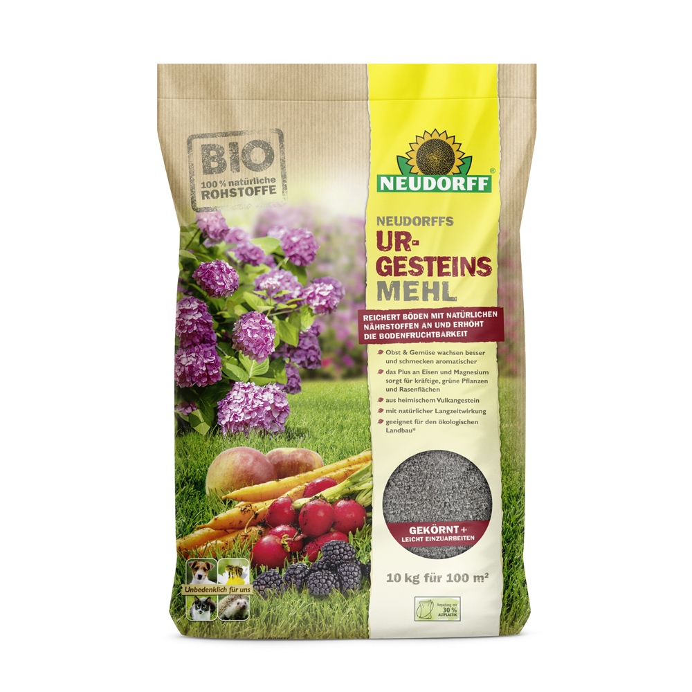 Neudorffs UrgesteinsMehl ist ein Bodenhilfsstoff zur Verbesserung der chemischen und physikalischen Eigenschaften des Bodens. Das Gesteinsmehl bewirkt die Wiederanreicherung des Bodens mit wertvollen Mineralsubstanzen und Spurenelementen. Es verbessert das Pflanzenwachstum, erhöht den Geschmack von Obst und Gemüse und erhöht die Lagerfähigkeit.